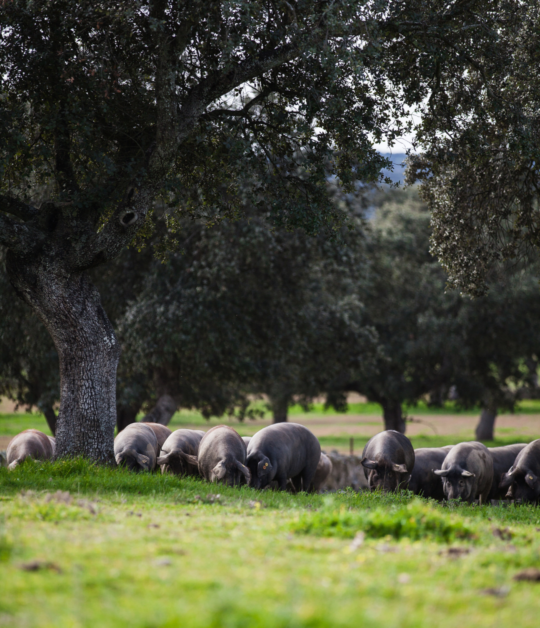 Los cerdos ibéricos criados en nuestras dehesas ofrecen un producto exclusivo, resultado de una alimentación natural y un proceso de vida en libertad.