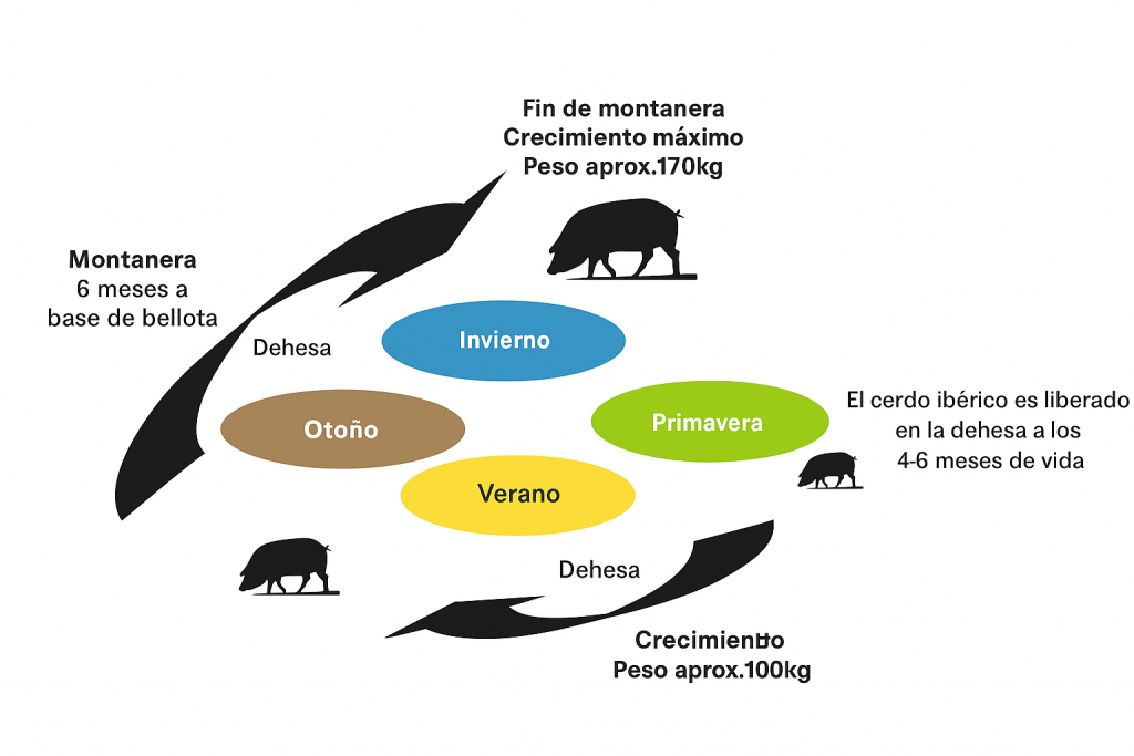 La montanera es el período en el que el cerdo ibérico vive en libertad en la dehesa, alimentándose de bellotas, hierbas y frutos silvestres. Se desarrolla de septiembre a febrero, coincidiendo con la maduración de la bellota.